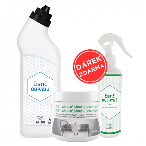 Alori Balíček pre čistý odpad + darček zdarma obsahuje dva produkty na skutočne čisté odpadové potrubia a navyše zdarma prostriedok na každodennú údržbu a upratovanie kuchyne.